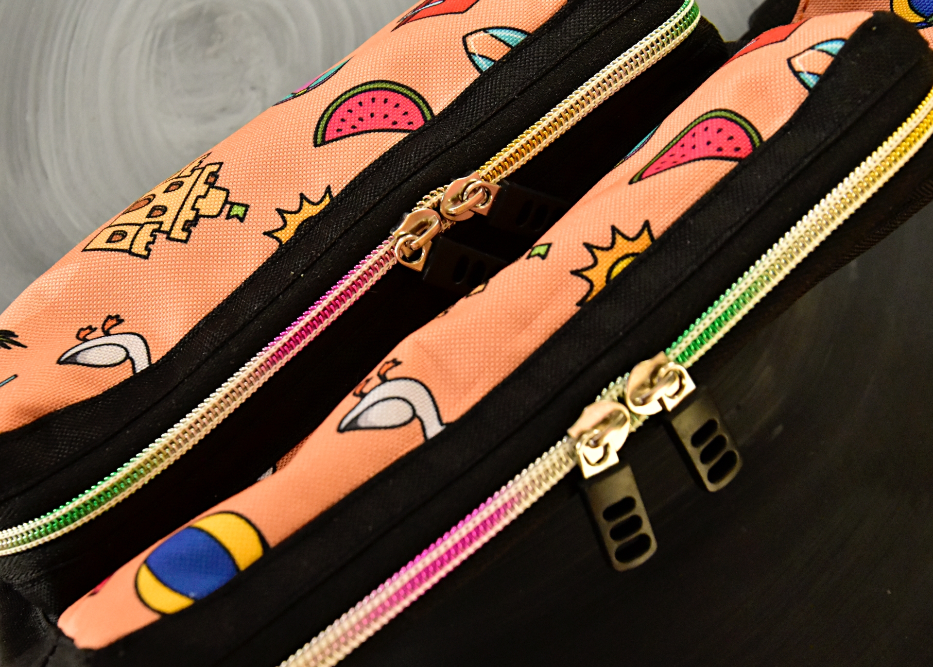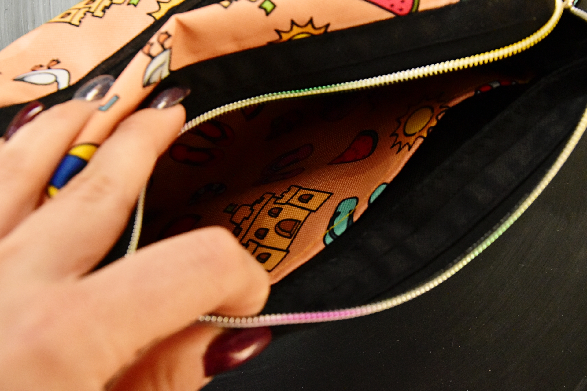 Nerka w całości wykonana jest z wodoodpornego materiału, wszystkie kieszenie od wewnątrz również podszyte są dodatkową warstwą wodoodpornego materiału, tak żeby po spacerze telefon nie pachniał jak sklep mięsny. Nerka ma dwie duże zapinane na zamek kieszenie. Przednia, mniejsza kieszeń – jest jedną komorą do której możecie np wsypać smaczki. Druga, duża kieszeń, w której możecie nosić zabawki, wodę i to czego jeszcze tylko potrzebujecie, ma w środku “przy ciele” wszytą płaską kieszonkę, w której idealnie zmieści się np. telefon. Zamki w obydwu komorach wyposażone są w dwa suwaki dzięki czemu możecie otwierać ją z dowolnej strony lub zostawić sobie nawet częściowo otwartą nie martwiąc się o to, że zostawicie za sobą ślad z rozsypanych chrupek.