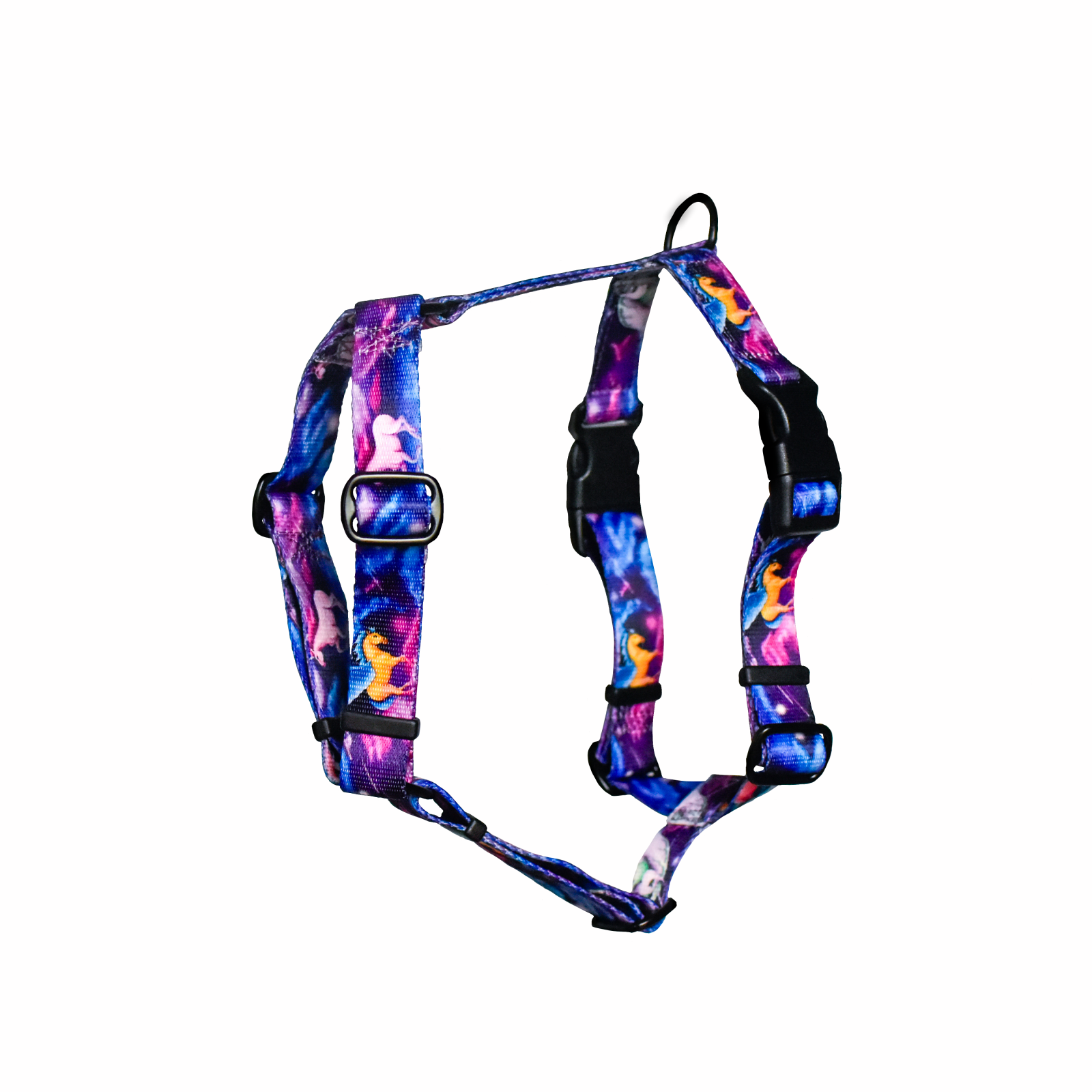 Szelki w standardzie wyposażone są w metalowe regulatory oraz posiadają dwie klamry na obręczy tylnej.